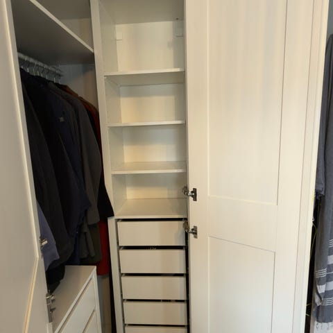 Tilbygningshjørneskab PAX med 4 hylder, 2 skuffer, 1 trådskuffe samt let luk hængsler. Er helt nyt, men samlet. Ialt er der for ca. 2.300. Sælges grundet fejlkøb. Artikelnr. hos IKEA - 703.469.32.