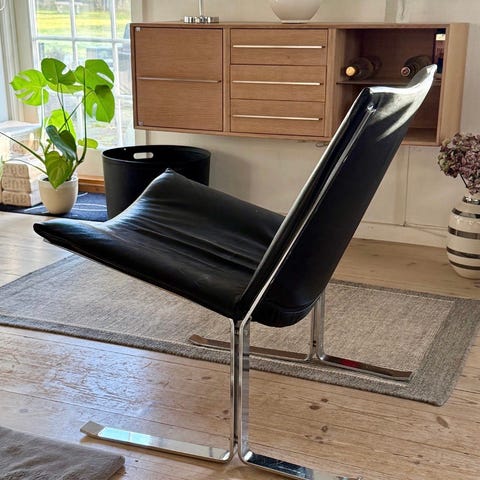 Lounge stol i sort læder. Børstet stål stel som dejer rundt. Er god som ny.