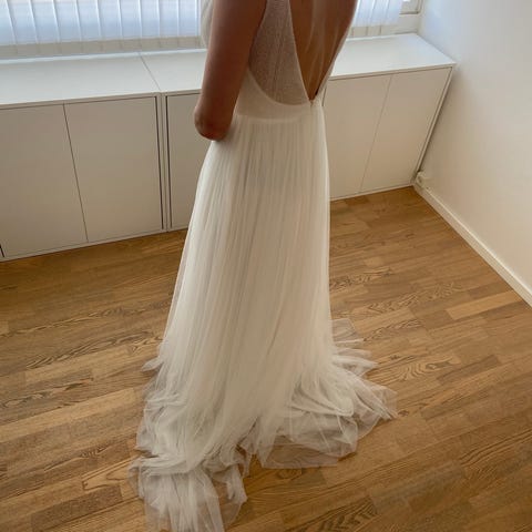 Jeg sælger min brudekjole+ Langt slør og hårpynt. Købt hos Dress Desires i København.