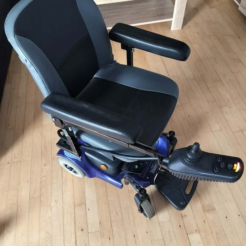 Sammenklappelig og næsten ubrugt el-kørestol af mærket Eloflex P. Modellen har elektrisk vippefunktion i sædet, der letter ind- og udstigning og gør overgangen fra siddende til stående mere sikker. Kørestolen kan skubbes, eller den kan styres med joystick. De store luftfyldte baghjul sikrer behagelig kørsel, selv på ujævnt underlag. Med to batterier som standard og plads til et tredje er rækkevidden op til 45 km, hvilket giver 7,5 timers brug på en enkelt opladning. Helt ny vinterjakke / kørepose medfølger. Vigtige parametre: