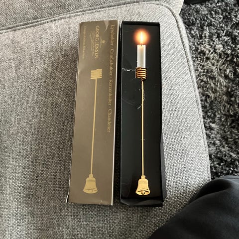 Georg Jensen lysestage med et dekorativt ornament i sort og guld. Designet til at holde standardstørrelse stearinlys. Materiale og størrelse ikke specificeret. Velegnet til brug som borddekoration eller til at holde lys sikkert på plads.