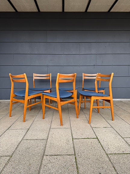 Trænger til ny polstring eller flet. En enkelt stol med lille skade på ryglæn (se sidste billede)