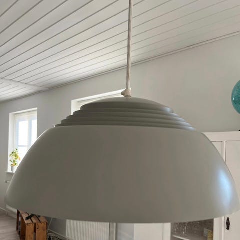 Sort Arne Jacobsen pendel på 50 cm. Original lakering med fire fatninger og sort stofledning.