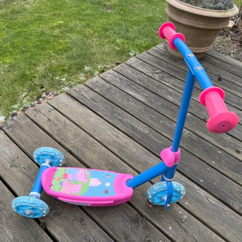 Peppa Pig Gurli Gris Løbehjul med tre hjul. Løbehjulet har et blåt og pink med Peppa Pig-tema på frontpladen og ståpladen.