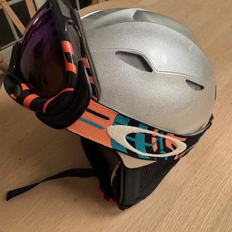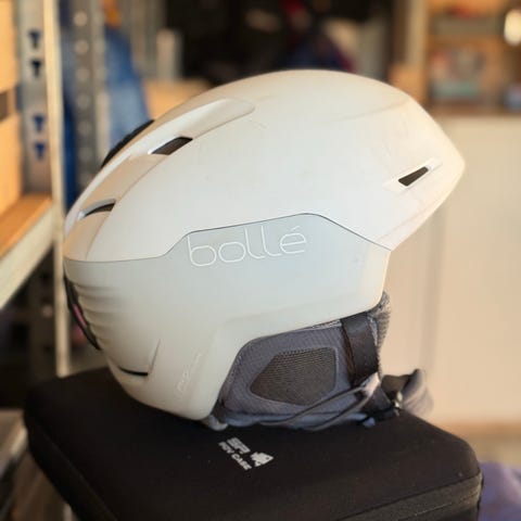 Bollé skihjelm i lys grå med visir så egne briller kan bruges under. Herre str. L