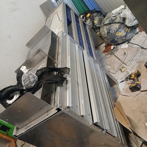 Bott bilindretning med to reolsektioner med skråhylde med plads til skruer og to lange sektioner med teleskopudtræk