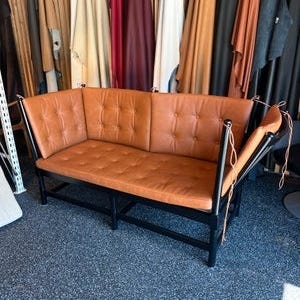 Minimale brugsspor, faste hynder og læderstropper intakte.