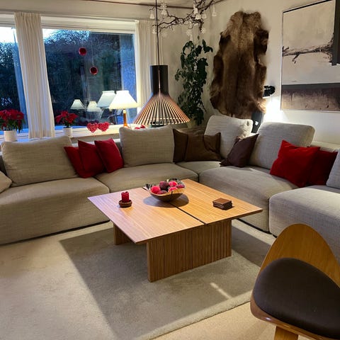 Stilren og behagelig hjørnesofa fra IMG Conform med plads til hele familien. Sofaen er betrukket med et stilrent og slidstærkt stof og står på træben i Valnød.