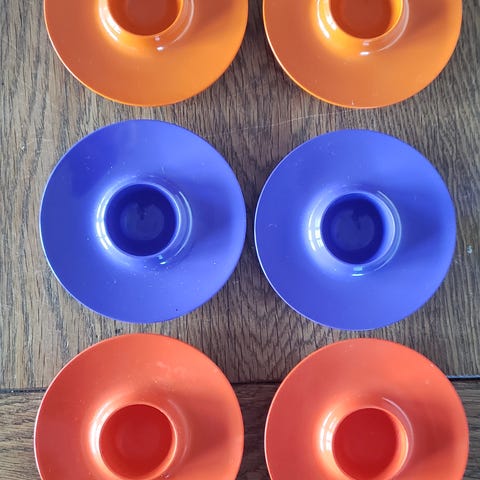 Rosti Mepel. Retro, vintage æggeholdere bestående af flere små skåle i forskellige farver (rød, grøn, blå, gul, sort). Skålene er lavet af plast og har en praktisk størrelse til servering og opbevaring i køkkenet.