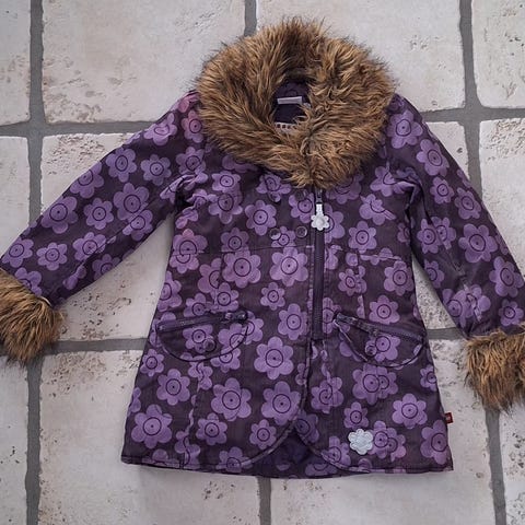 Lego Clickits børnejakke i størrelse 116 til piger. Jakken er beige med en hætte, der har en pelskant. Indvendigt er jakken foret med lyslilla materiale. Jakken er designet til at give varme og komfort til børn.