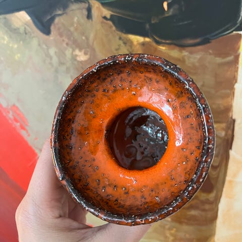 Keramik lysestage med en kombination af blå og brun farve. Lysestagen har en rund form med en indvendig holder til et stearinlys. Materialet er keramik, hvilket giver den en robust og dekorativ karakter.