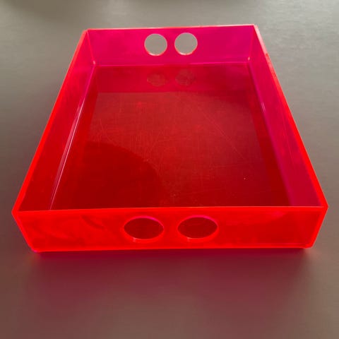 Pink gennemsigtig plastik bakke med to runde håndtag på siderne. Bakken har en rektangulær form og er velegnet til opbevaring eller servering. Overfladen viser nogle ridser, hvilket indikerer brug. Bakken er let og nem at håndtere.
