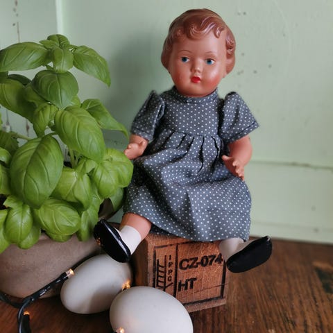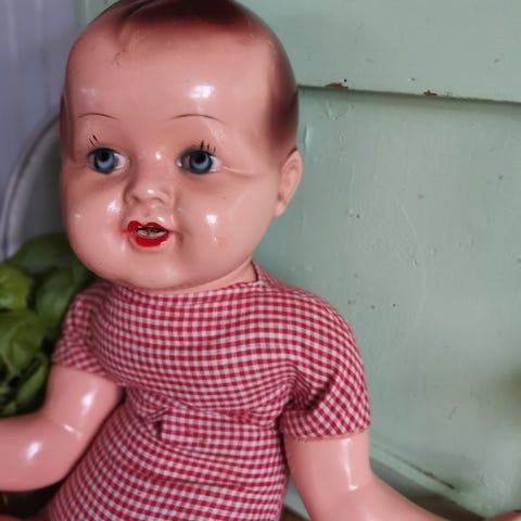 Tror det en dreng. Men kan nok ligeså godt være en pige. Vintage / gl dukke. Tror 50s / 60s. Har en sele på. Den lille kan have en sut i munden. Måler Ca 26 cm. ( Køge dukke)