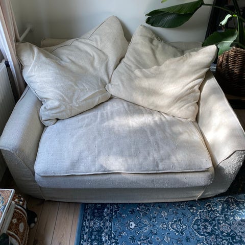 Ryglæn har 3 forskellige indstillinger...når den ligger helt fladt er total længde 115 cm, og helt oprejst er total længde 90cm. Må indrømme billederne er ikke de bedste, for den fremstår "plettet" i stoffet på billederne, men det er den ikke. Den fremstår meget pæn. Mærket er Innovation.
