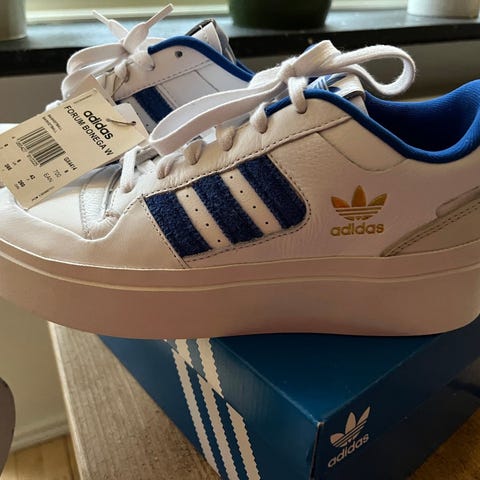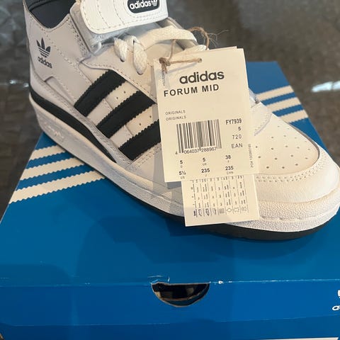 Adidas Forum sneakers i hvid farve, størrelse 39. Skoene har en høj ankel og er lavet af materialer, der sikrer komfort og holdbarhed. Designet inkluderer velcrorem og snørebånd for justerbar pasform. Egnet til daglig brug.