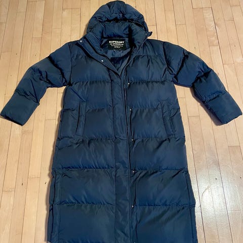 Superdry let, og varm vinterjakke i størrelse L til kvinder. Jakken har dobbelt lynlås foran, farverne mørkeblå og lyserød med sølvfarvede detaljer. Materialet er quiltet med en polstret konstruktion og inkluderer en hætte. Jakken er designet til at give varme og beskyttelse i koldere vejrforhold.