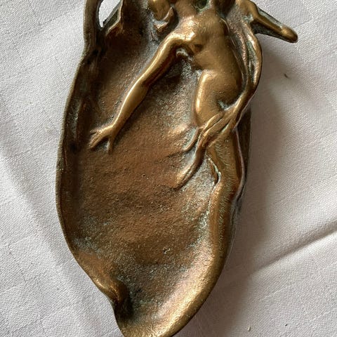 Forsølvet med motiv af kvindegigur og blomstemønstre. (Ikke mærket). Børste i metal med detaljerede udskæringer og dekorative motiver. Sættet er designet til rengøring og opsamling af smuler og småstøv. Metalmaterialet har et patineret udseende, hvilket indikerer alder og brug. Børsten har bløde børstehår.