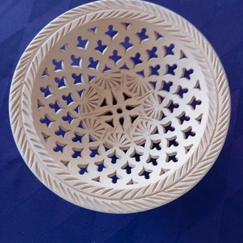 Keramik opbevaringskurv med blomsterdekoration på siderne. Kurven har en bølget kant og et flettet håndtag, som gør den nem at bære. Velegnet til opbevaring ( frugtskål ) eller som dekorativ genstand i hjemmet.