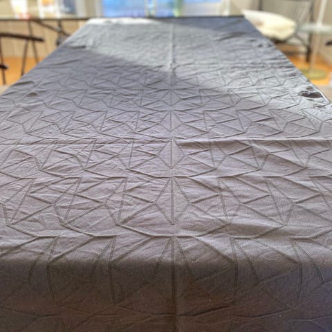 En elegant damaskvævet dug i et klassisk design, som er skabt af Arne Jacobsen. Det tidløse mønster er udvalgt blandt den ikoniske danske arkitekts efterladte skitser og skaber en smuk symmetri og et stilfuldt udtryk i en moderne borddækning.