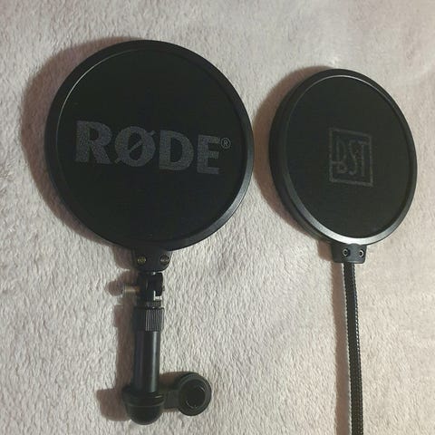Røde popfilter til mikrofon i sort farve. Popfilteret har en rund form og en fleksibel arm for nem justering. Designet til at reducere plosiver og forbedre lydoptagelse ved brug med mikrofoner.