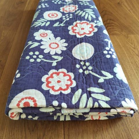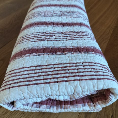 Quiltet tæppe i lyserød farve, fremstillet af bomuldsmateriale. Tæppet har et mønster med diagonale syninger, der giver en struktureret overflade. Velegnet til brug som sengetæppe eller til afslapning i hjemmet.