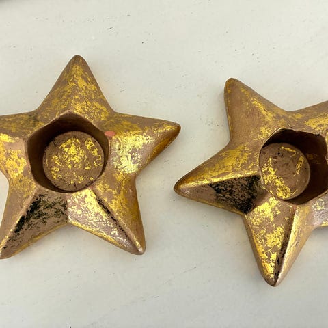 lysestager med engle og stjerner i rød metal, højde ca. 10 cm. Designet til at holde små fyrfadslys. Velegnet til dekoration ved højtider eller som stemningsbelysning.