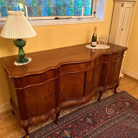 Flot skænk i massivt træ. Super solid og rummelig. 2 skabe og 4 skuffer. Pæn bagside, så den kan stå midtby et rum - også med mulighed for at skjule strømforsyninger mv., da bagbeklædningen ikke går helt til gulv. Det har vi været rigtig glade for, ift. ledninger og andre ting, der ikke er for kønt at have liggende langs panelerne.