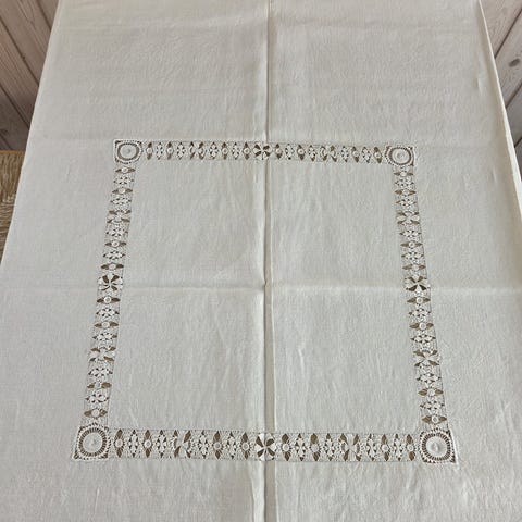 Helt unik hør dug. Dugen er en gammel dansk hørdug, som i 1978 er omskabt til en hørdug med stoftryk i auberginefarve. Virkelig smuk brugskunst. Signatur i hjørne "april 1978". Dugen er i fin stand.