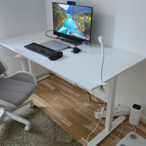 Skrivebord STAUNING 80x160 hvid med træfiberplade, og hvide lakeret stålben. Fødderne kan justere med en stilleskrue. Nypris 800 hus jysk.