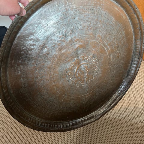 Lækkert fad/bakke Arabisk tror jeg ud fra mærket bagpå. Er brugt med fremstår superflot med patina. Er fra røg og dyrefrit hjem.