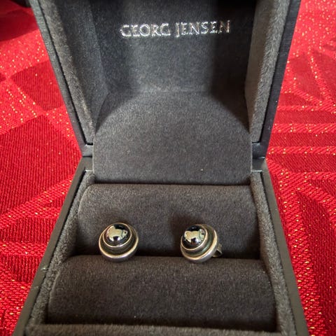 Georg Jensen sølv ørestikker til kvinder. Fremstillet i sølv med et rundt design. Leveres i en sort æske med mærket Plaza.
