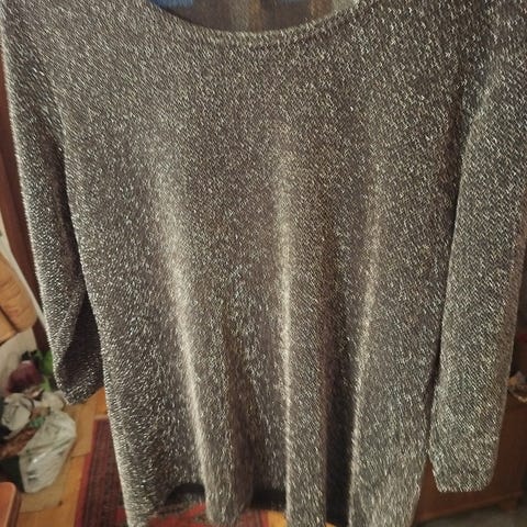Flot bluse i sølv farvet, meget blød. Brugt 1 gang. Måler 60 cm til syninger i siden, altså 120 cm i diameter. Kan blinde knude i siden. Lidt gennemsigtig i nogle felter, se billed hvor hånd er inde under.