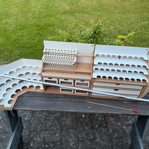 Brugt men fint værksteds bord . Nypris i Harald Nyborg 385 kr . Nemt at samle og skille ad med click system
