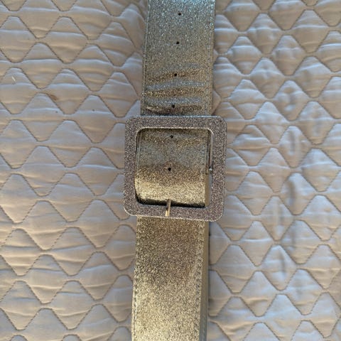 Flot glimmer bælte i sort. Der 10 cm til første hul, så vær obs på det selv om bælte måler 99 cm. Er IKKE læder/skind.