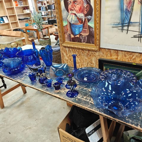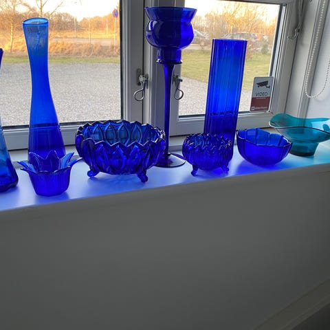 Blå glas vaser,flasker,lysestager, fade,skåle sælges samlet. Se også mine andre annoncer her på dba. Sendes helst ikke pga vægt/emballage.