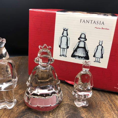 Holmegaard Fantasia glasfigurer - sættet består af konge, dronning og lille glas-prins - designet af Maria Berntsen for Holmegaard. Kongen har lidt brugsridser.
