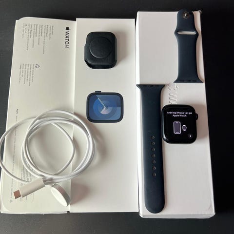 Apple Watch Series 9 med 45 mm Midnight blue aluminiumskasse. Og Midnight blue sportsurrem. Fejlkøb. Ved Elgiganten oktober 2024. Sportsurrem i uåbnet kasse. Ubrugt. lader i uåbnet kasse ubrugt. Ur brugt ganske lidt uden synlige brugsspor. Alt i originalpakning. Ur har GPS. EKG måling og puls måling. Godt sportsur.