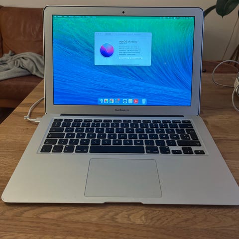 Apple MacBook Air laptop i sølv farve med aluminiumskabinet. Bærbar computer designet til daglig brug med let vægt og kompakt størrelse. Oplader medfølger.