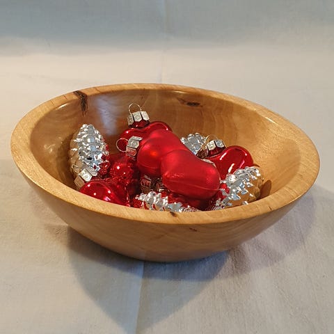 Træskål fremstillet af lyst træ med en rund form og en glat overflade. Skålen har en naturlig træstruktur og en let buet kant. Den kan anvendes til opbevaring af små genstande eller som dekorativt element i hjemmet.
