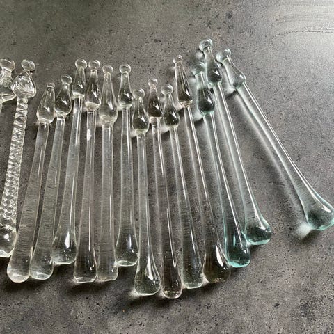 To rørepinde eller toddystødere i mundblæst glas med længde 17 og 18 cm., fra ca. 1900 og antagelig Holmegaard.