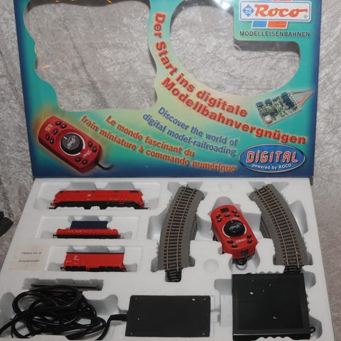 DIGITAL startsæt med Disel LOK BR 215 i rød udgave, 2 godsvogne, skinner til en oval på 100x115 cm. Digital kontrol enhed, LOK -maus følger ikke med. Sættet er nyt. Har aldrig været ude af emballagen. Hvis du kører med andre skinner end ROCO, kan vi aftale en returpris for skinnerne, eller evt. bytte dem til den type skinner du bruger.