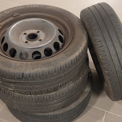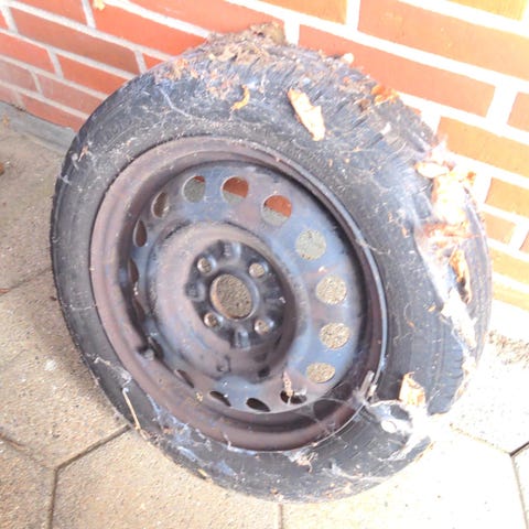 5 dæk med stålfælge til en Aygo. De har målene med 155x65x14