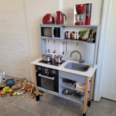 Legekøkken med tilbehør bestående af forskellige madvarer og køkkenredskaber i træ og plastik. Inkluderer gryder, pander, tallerkener, madvarer som grøntsager, ost, brød og æg samt køkkenmaskiner som vask og ovn.