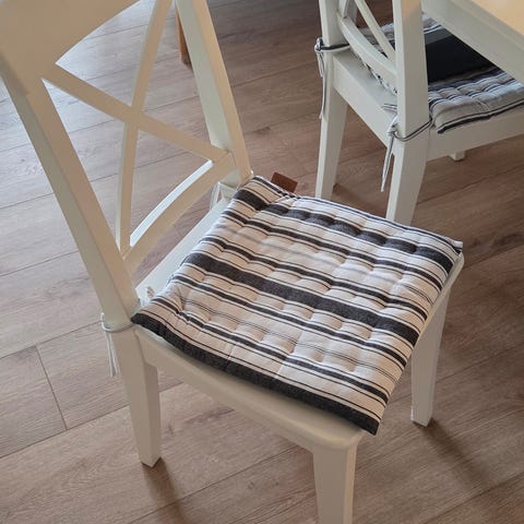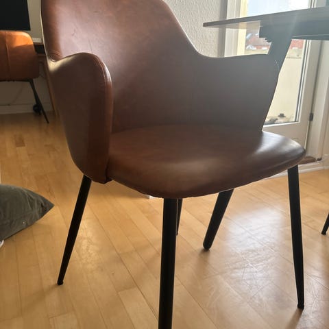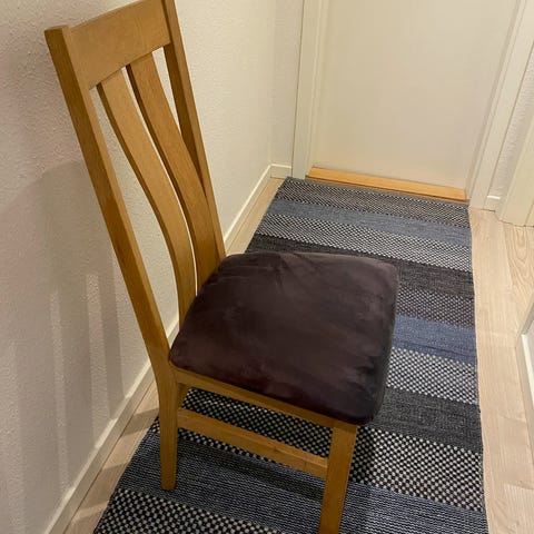 Helt ny 6 xSpisebordsstol i lyst træ med polstret sæde i lys beige tekstil. Stolen har buet ryglæn og armlæn i ét stykke samt fire lige ben. Designet er enkelt og egner sig til brug ved spisebord eller som ekstra stol i stue eller køkkenalrum. Sædet er let polstret for øget komfort, og de neutrale farver gør stolen nem at kombinere med forskellige borde og indretninger.
