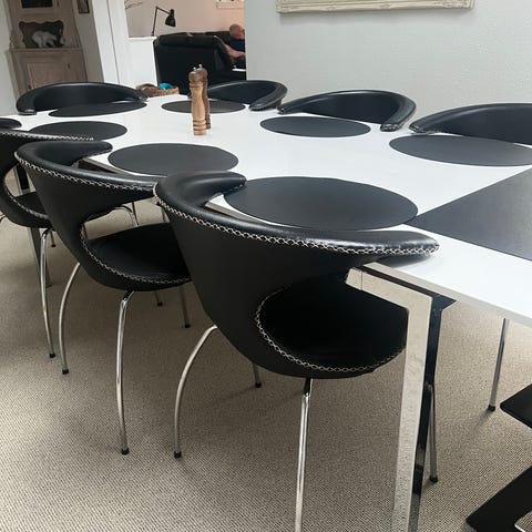 "Bordet har enkelte små bobler og mindre ujævnheder, som kan ses på billedet. Jeg ønsker at sælge bordet og vil blot informere om disse små detaljer."