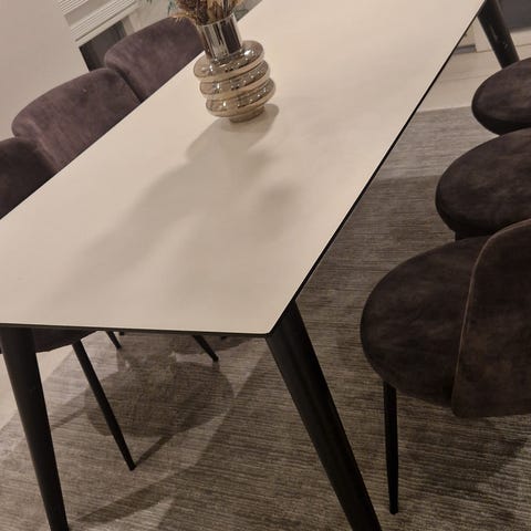 Mønsteret er ikke identisk med bordpladen, men passer stadig flot sammen og giver et harmonisk udtryk. Man kan sætter tillægsplader i enderne.