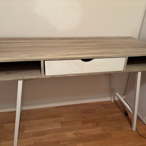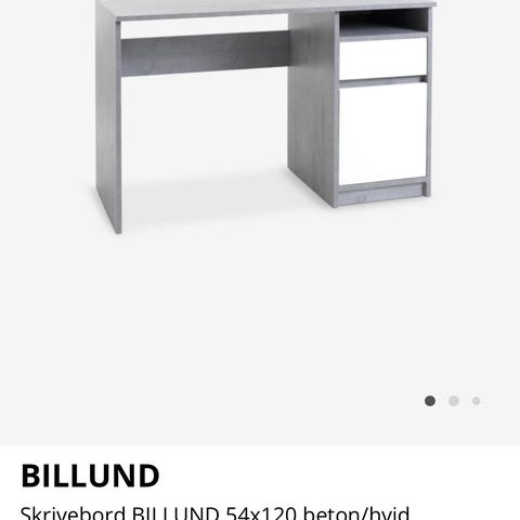 Jysk Billund skrivebord med grå overflade, mål 120x60 cm. Skrivebordet har en enkel og funktionel opbygning med en hylde og en skuffe til opbevaring. Materialet er robust og egnet til daglig brug i hjemmet eller på kontoret. Har en lille fejl, ved lågen som kan ses på billede nr 2. Ikke tydeligt vil jeg selv sige. Prisen kan forhandles:) købte den til 1000kr fra jysk