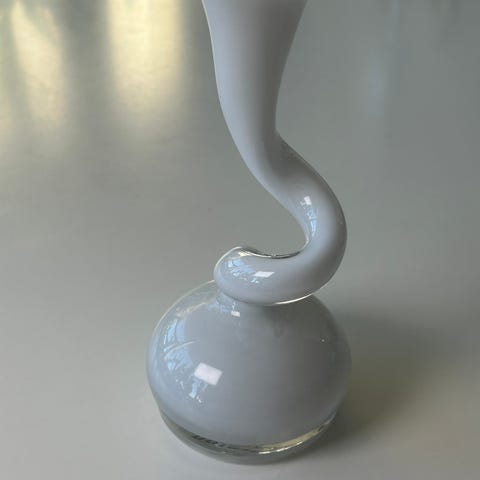 2 stk Normann Copenhagen glasvaser i rødt glas med hvid indvendig belægning, som snor sig i en spiral. Kan bruges til roser. Den ene vase har en mindre skade på kanten, som vist på billedet. Velegnet til dekoration og brug med enkelt rose eller kunstblomt.