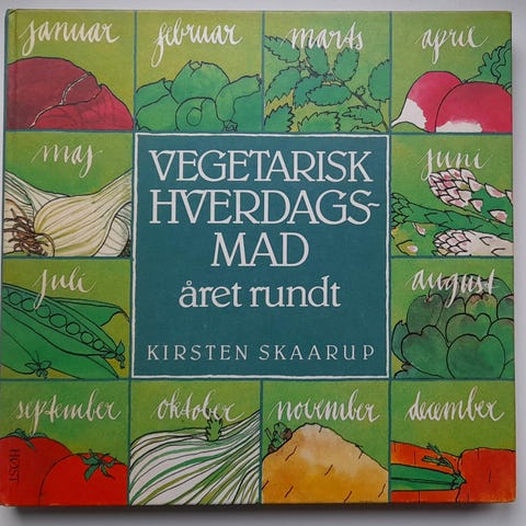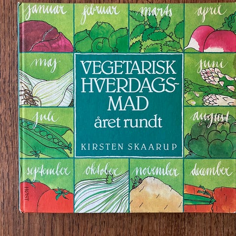 Af Kirsten Skaarup. Tegninger fa Gurli Feilberg. 1984. 154 sider, ill, ib. - Kogebog med opskrifter på daglige retter, supper, hovedretter, salater, tilbehør og nogle få desserter, lavet af sæsonens grønsager, opdelt efter årets tolv måneder, i kombination med kornprodukter, ris, bønner, nødder og frø