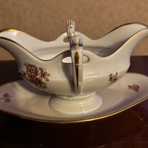 Fade, tallerkener og lille vase med grønt og guld blomster motiv. Der er en kant med dutter, en guldkant og en grøn kant. Bagpå er der et våbenskjold med et P og T på hver side med krone over. Under våbenskjoldet står der "Bavaria Tirschenreuth Germany".